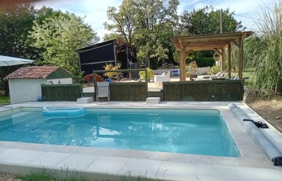 The pool and sun terrace are situated in the gardens to the rear of the gite and house,